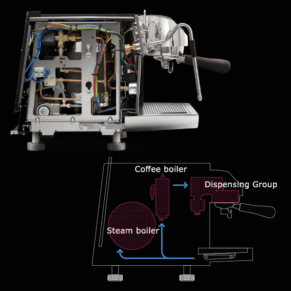 - Linea Mini は デュアルボイラー(エスプレッソ用&スチーム用)を搭載しており、それぞれの温度を独立して管理できるため、安定した抽出と強力なスチーム性能を持つ。
